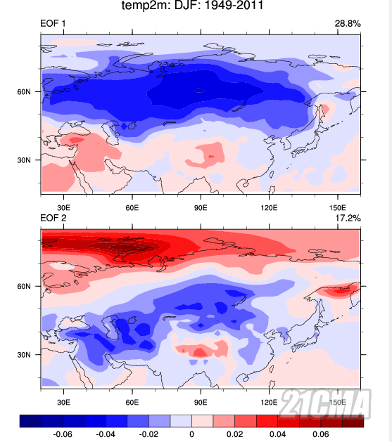 摘要 利用NCEP/NCAR再分析资料,总结了欧亚63个冬季温度变化的主要模态及其与大气环流和外强迫的关系:(1)第一模态表现为欧亚大陆中高纬一致的偏冷和偏暖变化,环流上和北极涛动联系密切,年代际变化十分显著。(2)第二模态表现为欧亚大陆中南部和北极地区气温的反位相变化,与新地岛-乌拉尔山一带和巴湖-贝湖地区的偶极子环流异常有关,该模态在05年以来尤为活跃,且与北极海冰减少相关紧密。